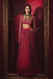 Fucshia embroidered net printed chiffon blouse with printed rushed lehnega and printed chiffon embroidered cape