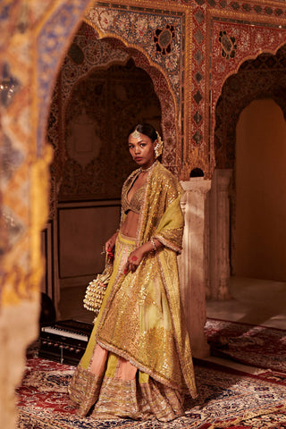 Color block linen lehenga with lampi boarder ; paired with our signature lampi blouse and an organza dupatta embroidered with gota patti, edged with khari kiran boarder.