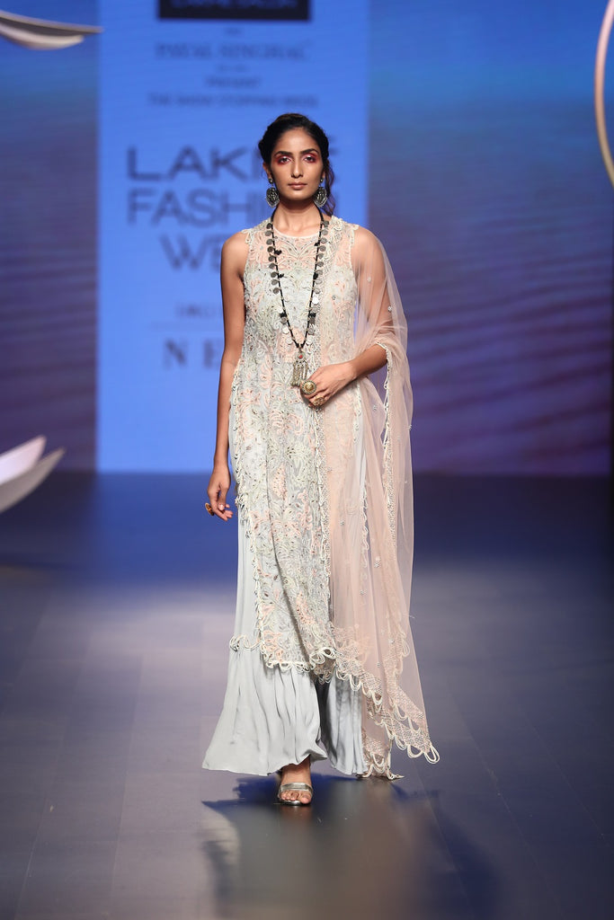 Off-white organza fray embroidered sleeveless kurta and powder blue crepe blouse with sharara pants and rose pink net embroidered dupatta