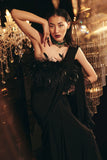 Black chiffon draped saree with feather embellished saree gown