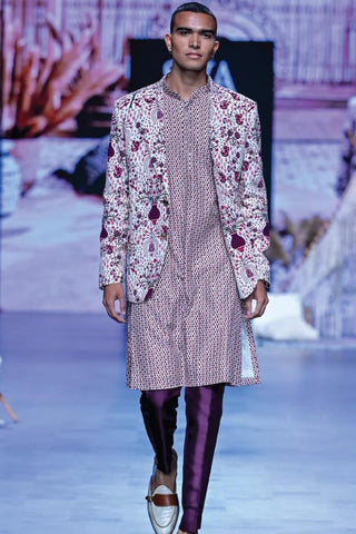Featuring a safar merlot jaal blazer paired with merlot geometric embellished kurta with pants