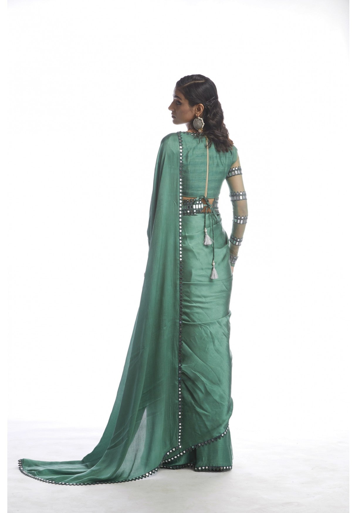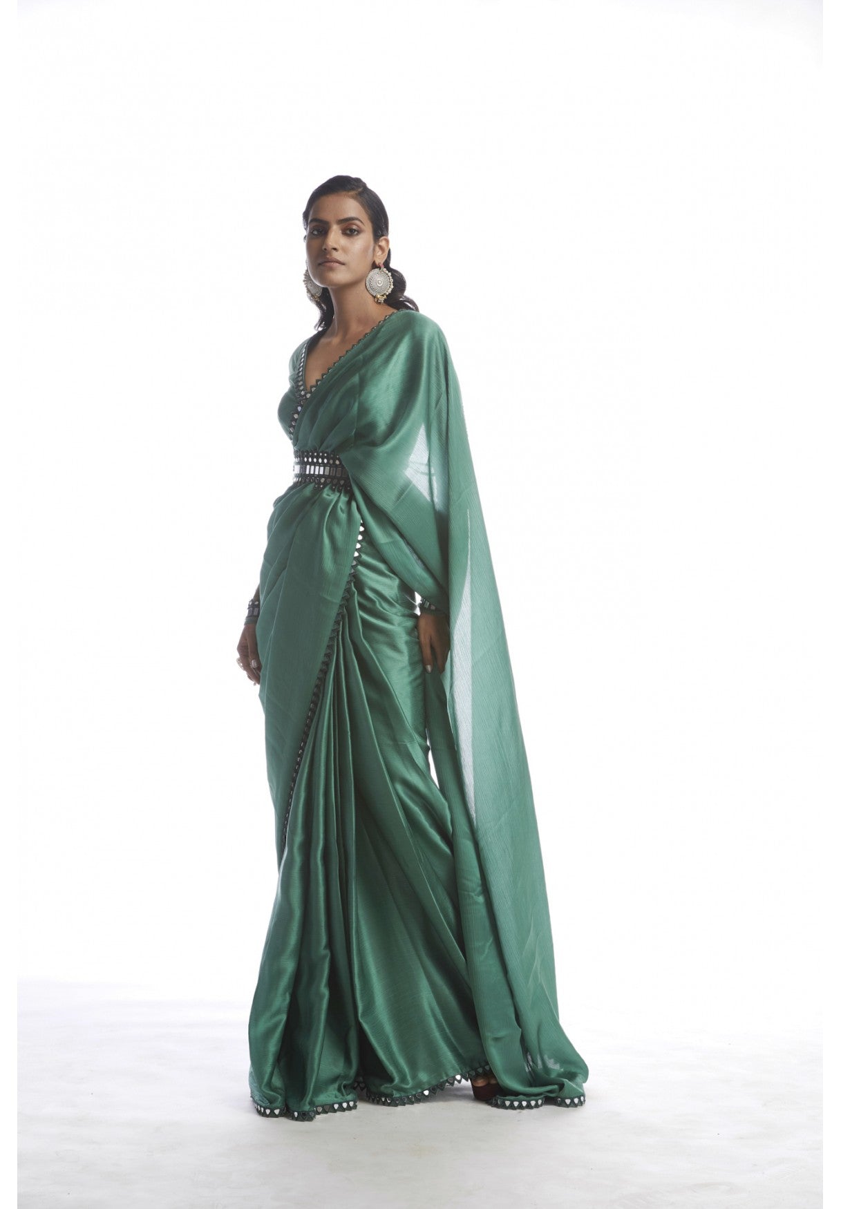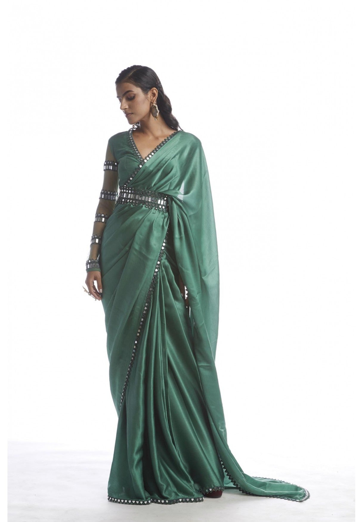 Satin Chiffon Satin Chiffon Saree Paired Paired With Chiffon Saree Paired With Mirror Cut work Belt and Mirror Embellished Round Neck Net Blouse.