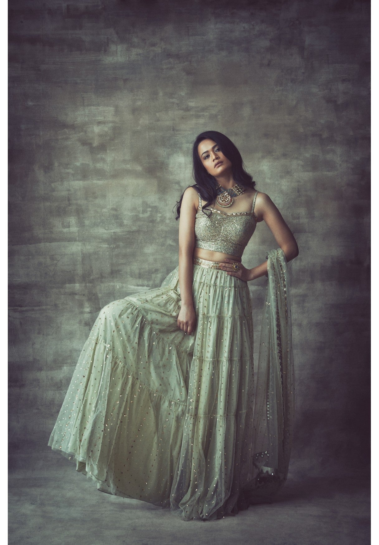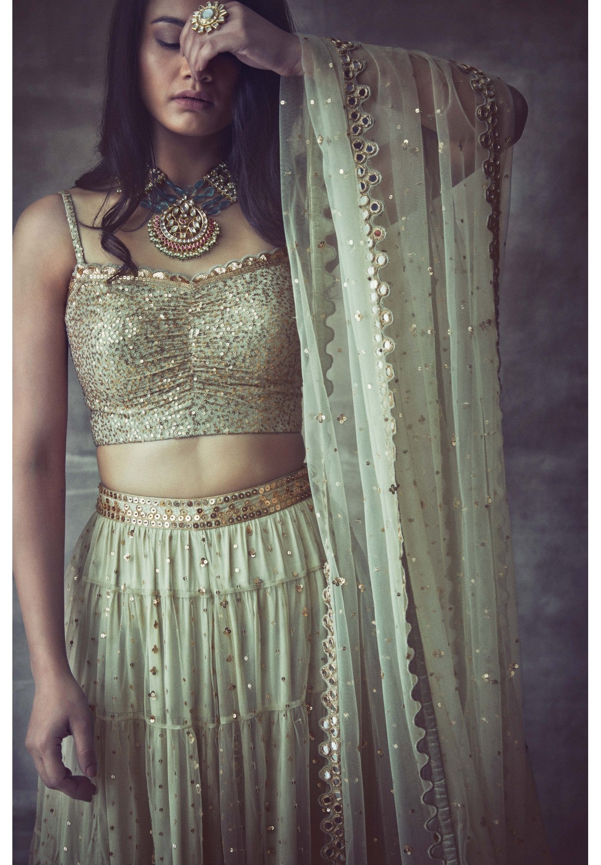 Delicately hand embroidered spaghetti gather sweetheart crop top wiwth a sequin sprinkle sharara set and dupatta with mirror borders.