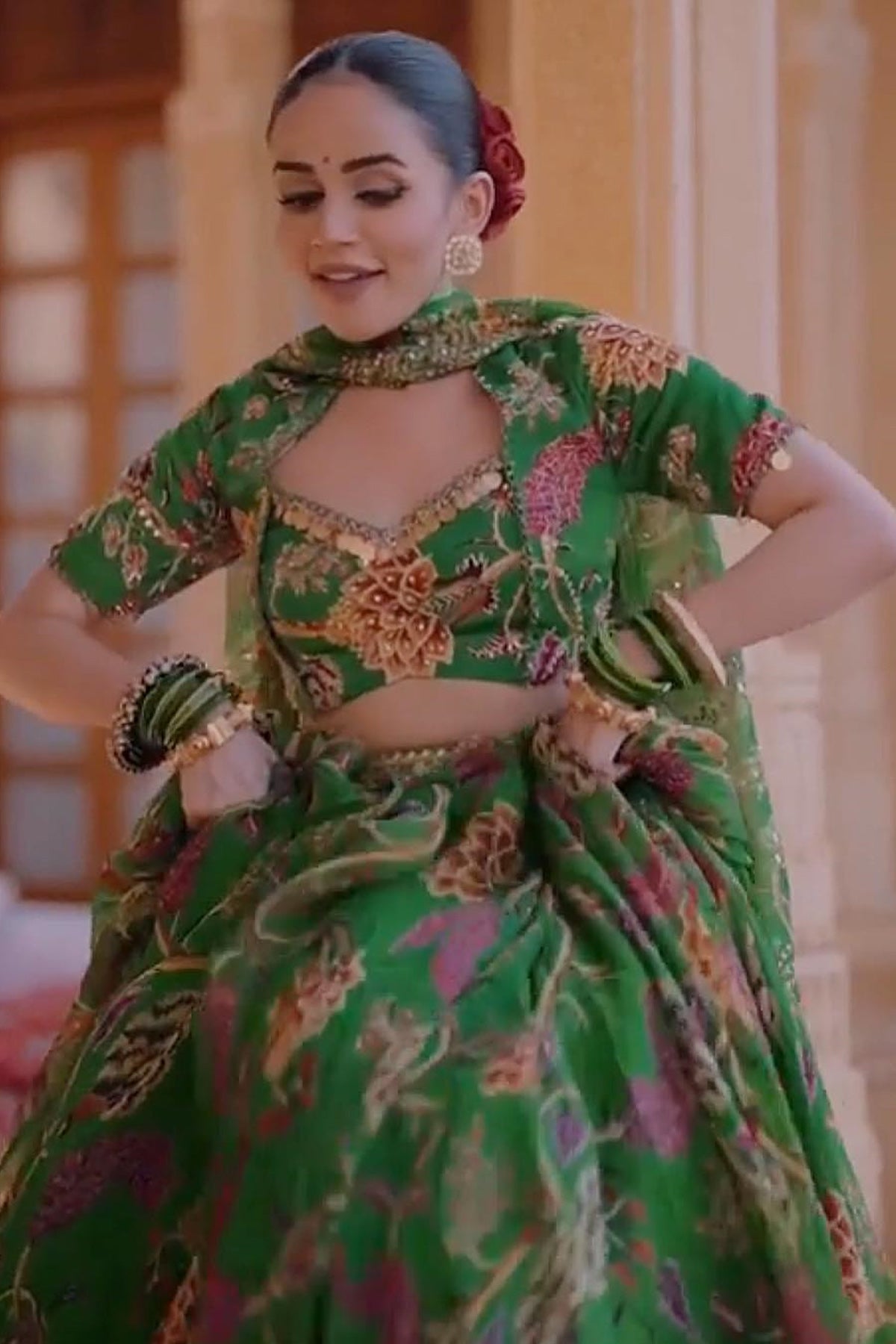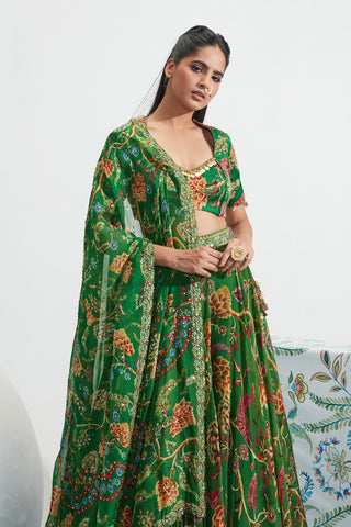 green satin organza embroidered blouse, embroidered organza lehenga and embroidered organza dupatta with tassels hem detaling set