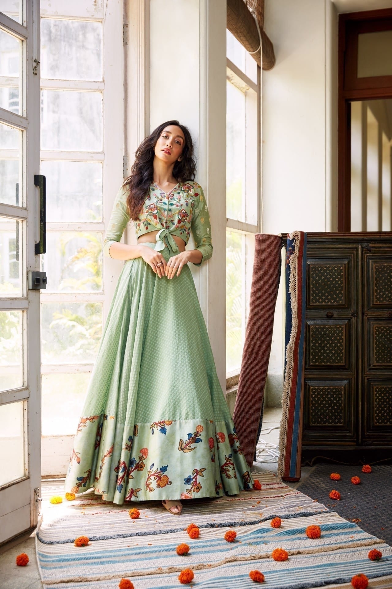 Label Anushree : Hand embroidered knotted shirt & a high waisted skirt with a silk kalam border