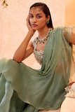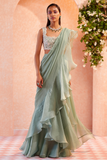 Sea green net embroidered blouse and chiffon-organza draped ruffle saree