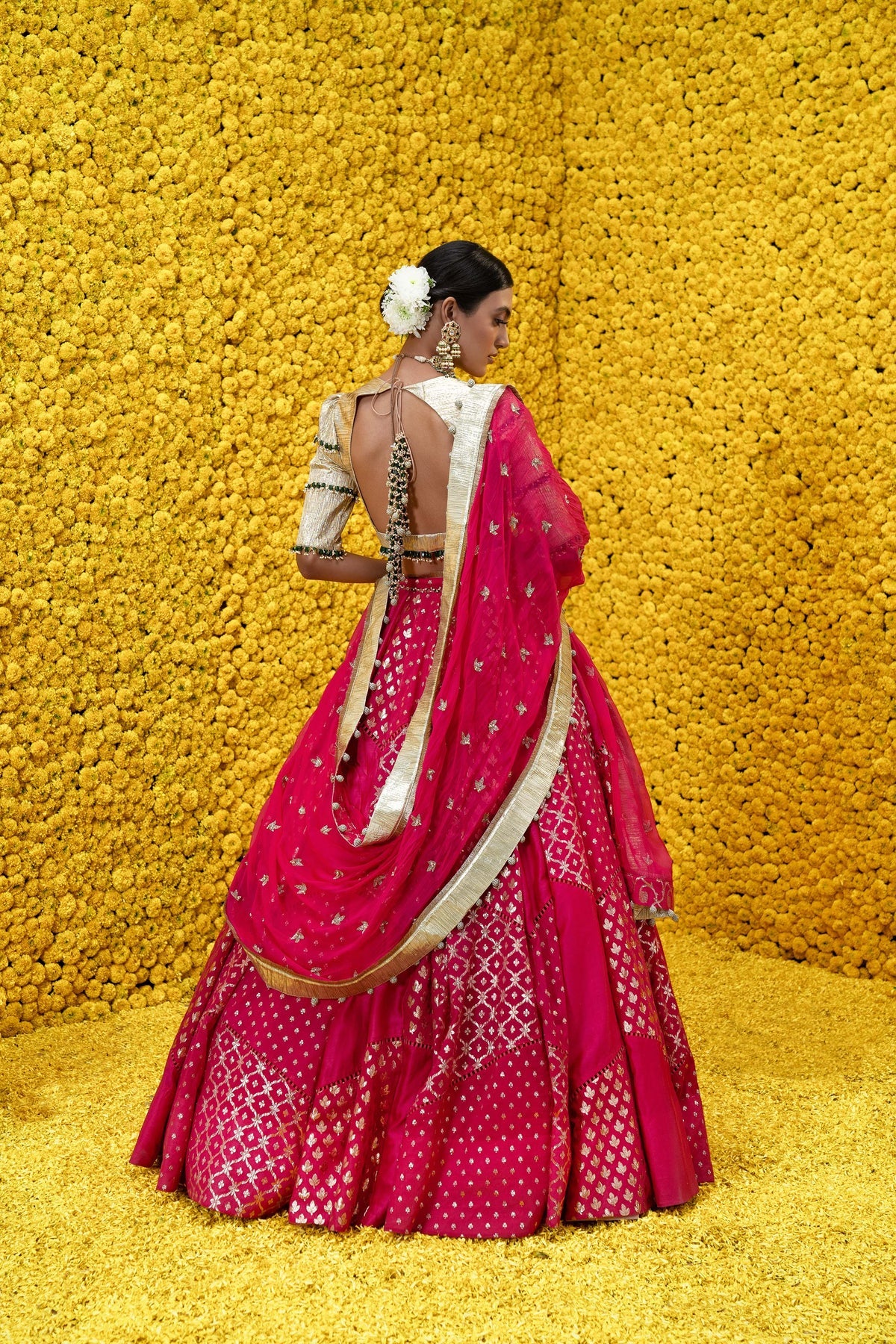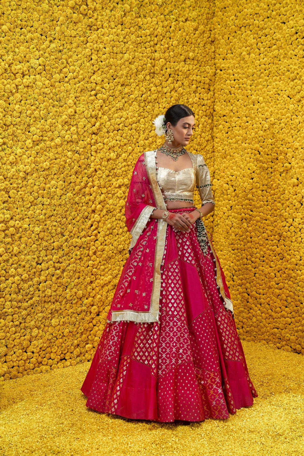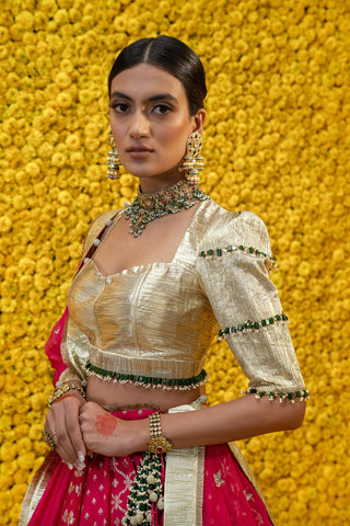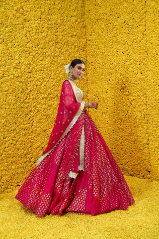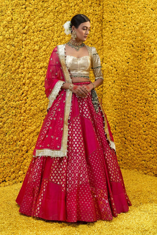 Hot pink, Banarsi Chanderi lehenga with golden blouse and embroidered dupatta with tassels.
