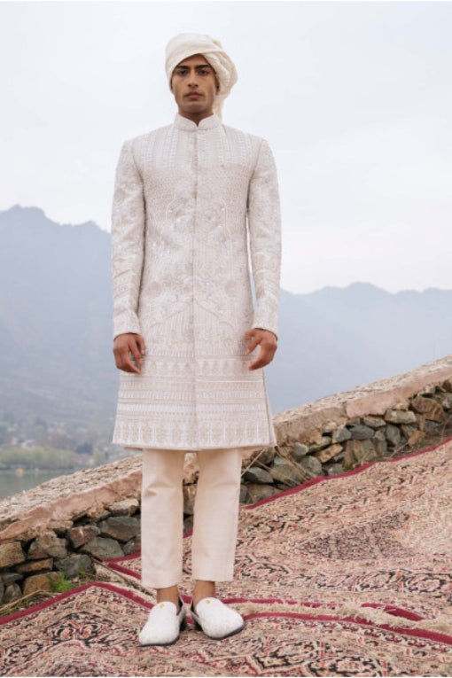 - IVORY, COLLARED SHERWANI WITH INTRICATE REGAL IN SILVER THREADWORK DETAILS, STYLED WITH A PAIR OF RAW SILK PANTS AND A SAFA.