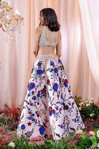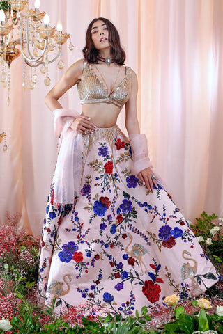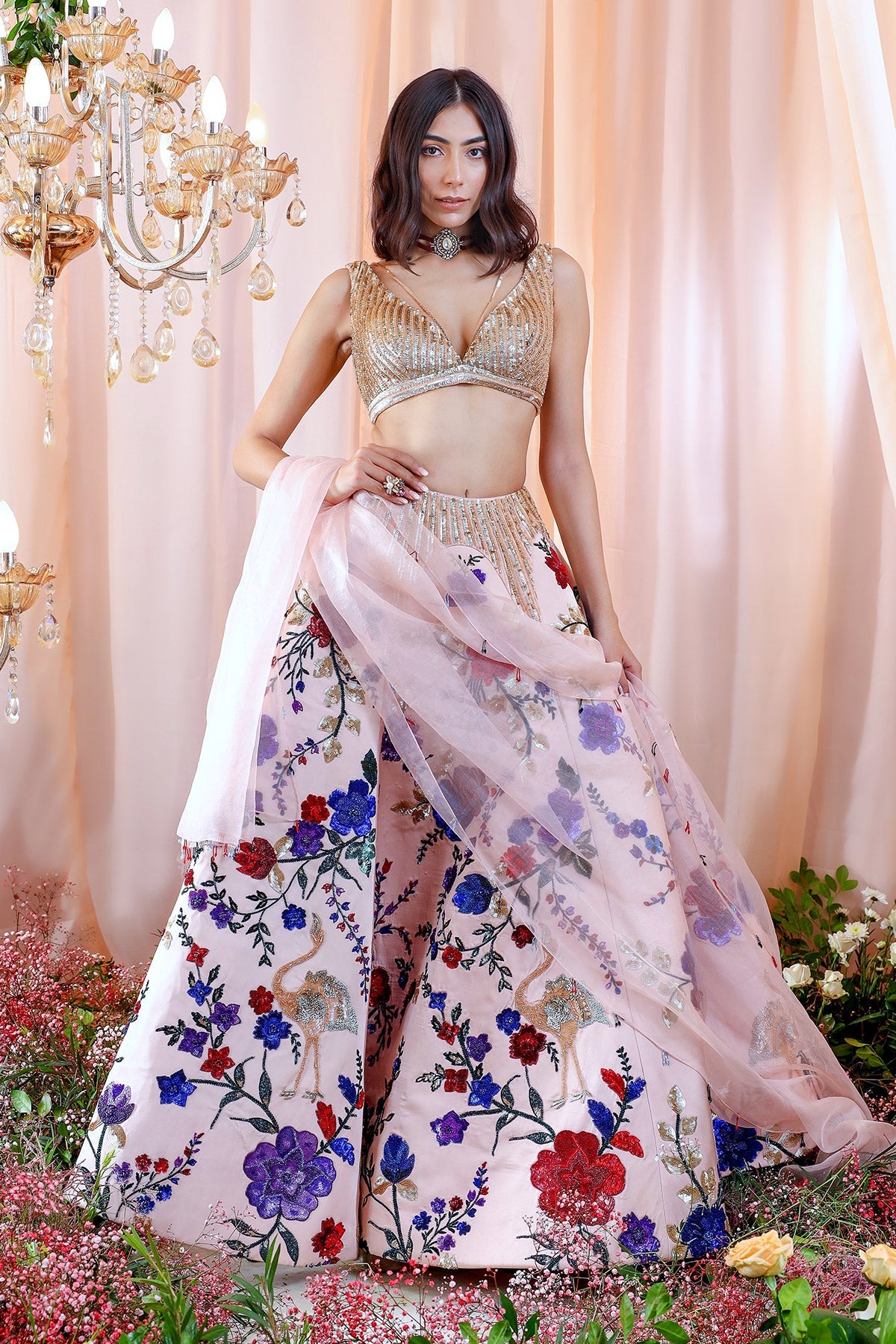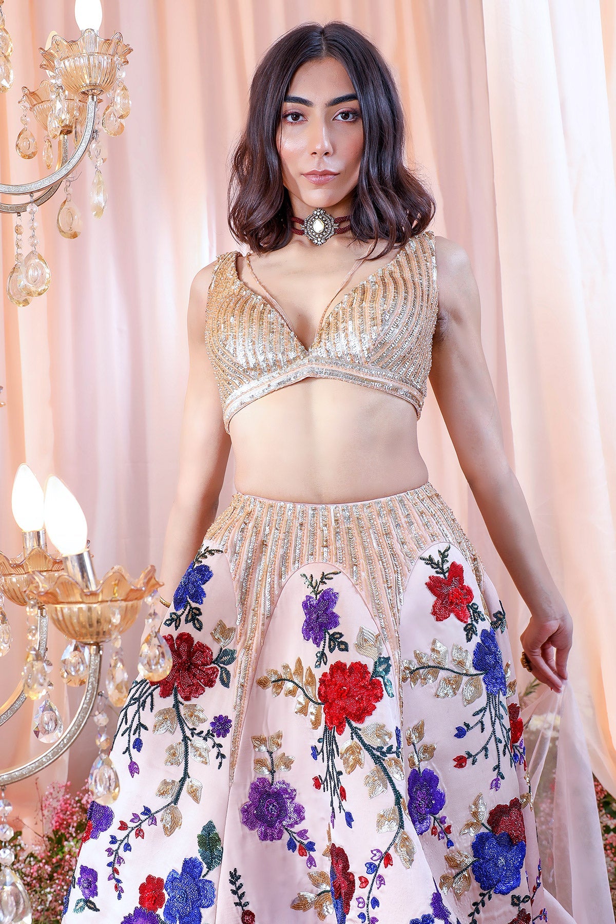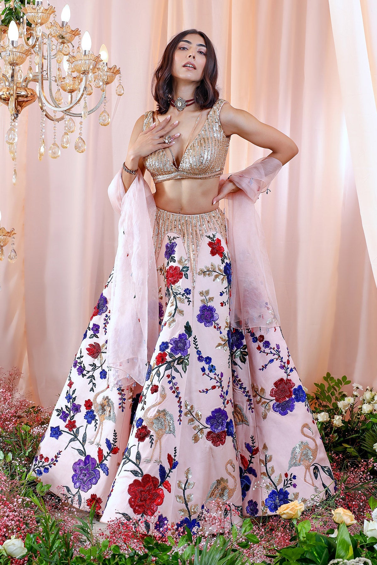 Rose Quartz Satin Organza Lehenga, With Embroidered Blouse And Tassel Dupatta