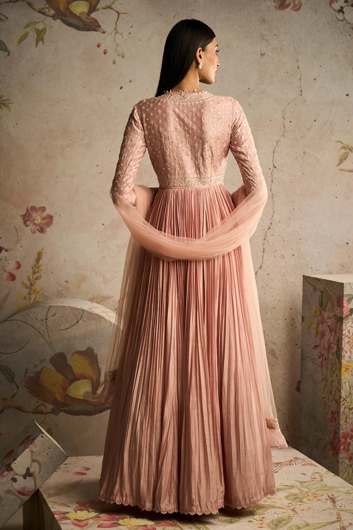 Dusky Pink Fine Silk Embroidered Long Anarkali With Net Embroidered Dupatta