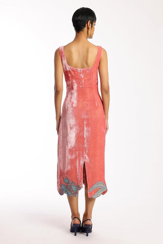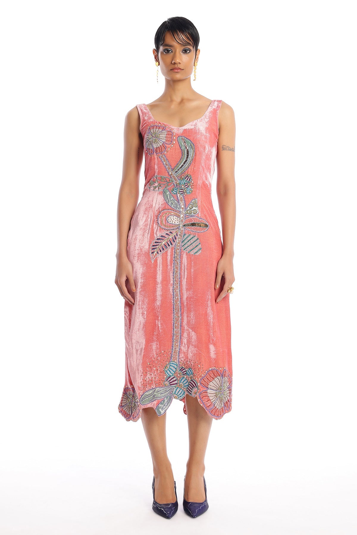 Kinfolk salmon applique embellished velvet ankle length cutwork edging gown