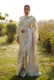 • BISCOTTI, TULLE-BASED SAREE WITH FLORAL MOTIFS IN LIGHT GOLDEN CHROME APPLIQUE DETAILS AND A FADED BLUE FEATHERED-BORDER. THE SAREE IS STYLED WITH A FULL-SLEEVES BLOUSE REPLETE WITH TASSLE DETAILS