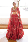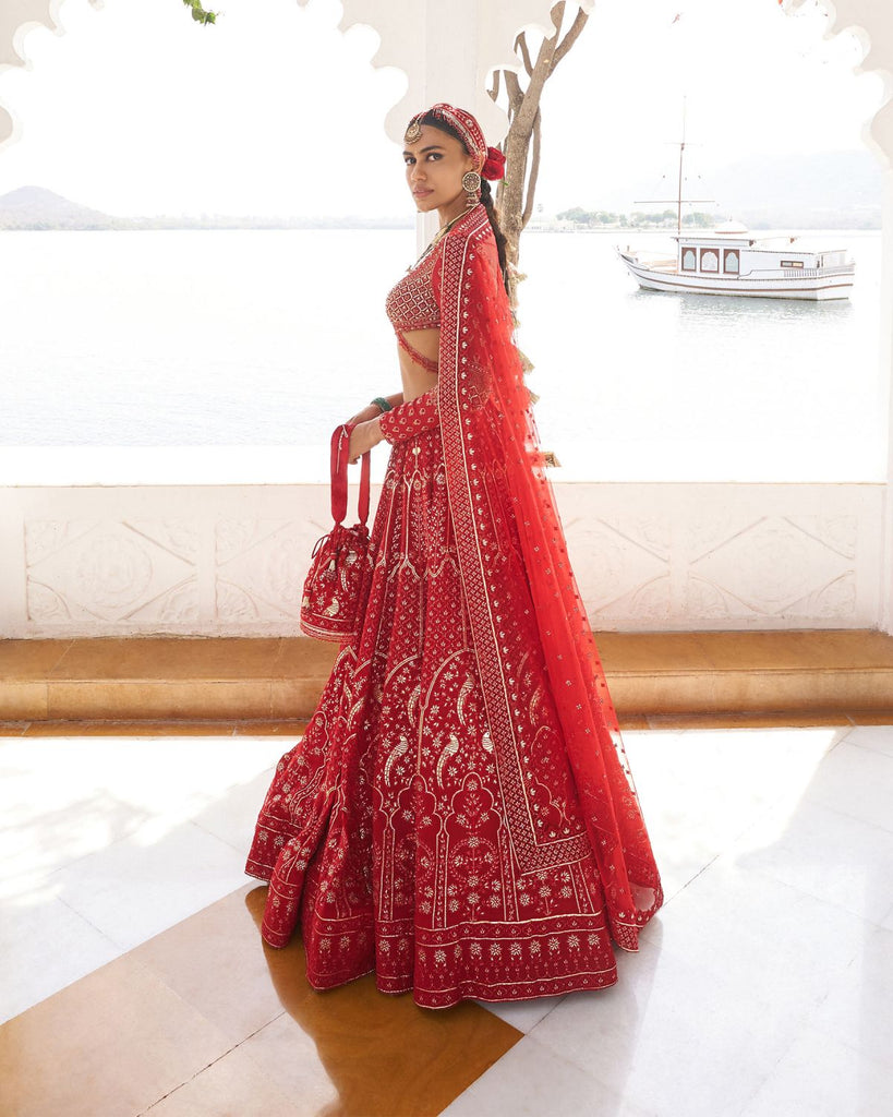 Red chrome applique Lehenga with silk threads, foliage motifs, teamed with a hand-embroidered raw silk blouse with tassel details and a tulle dupatta.Red chrome applique Lehenga with silk threads, arch motifs, teamed with a hand-embroidered raw silk blouse and a tulle dupatta.