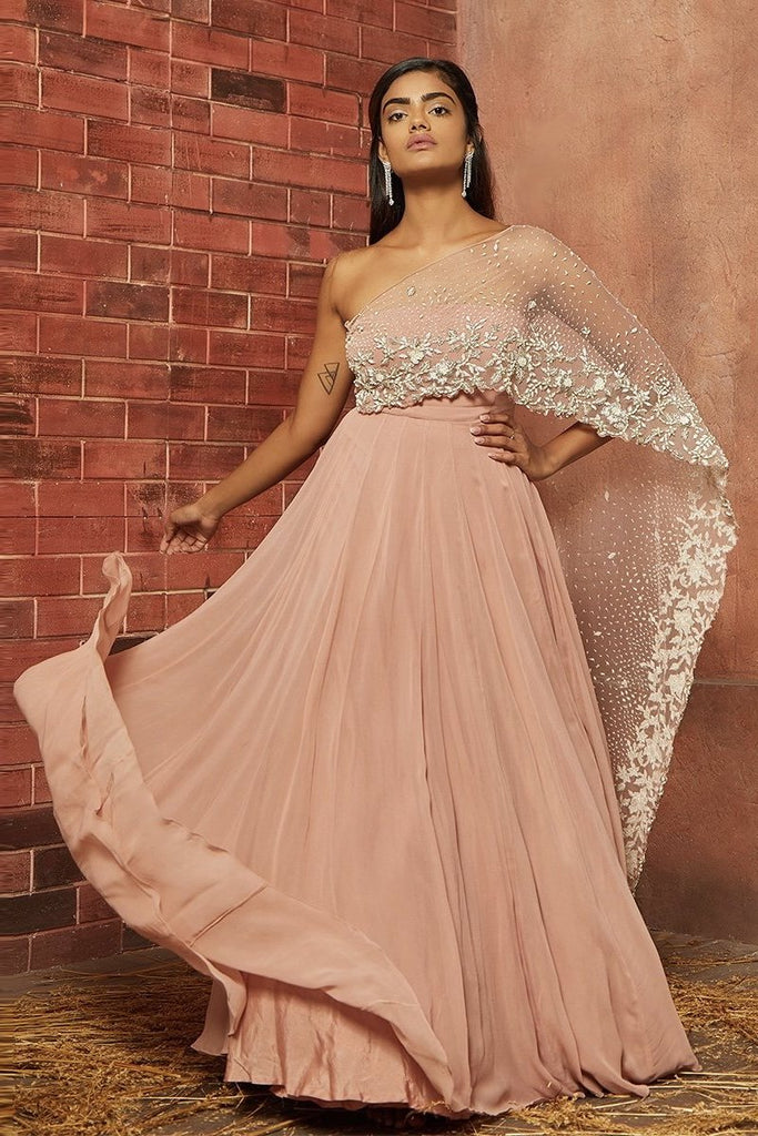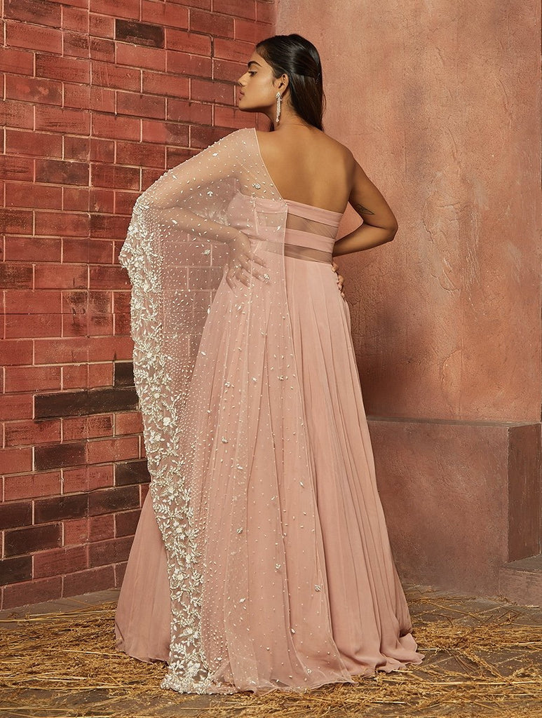 Soft pink georgette tube gown with a net drape hand embellished with pearl & bead work