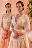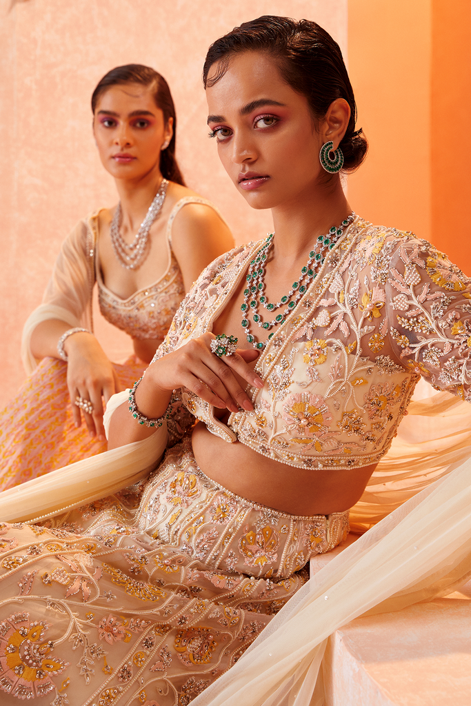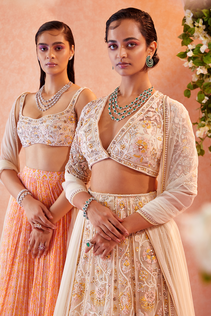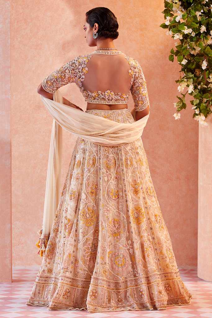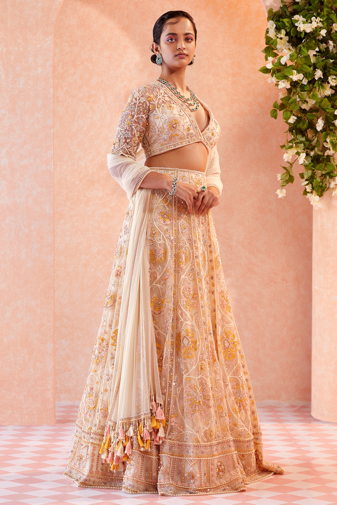Dusty ivory net embroidered blouse and lehenga paired with net dupatta