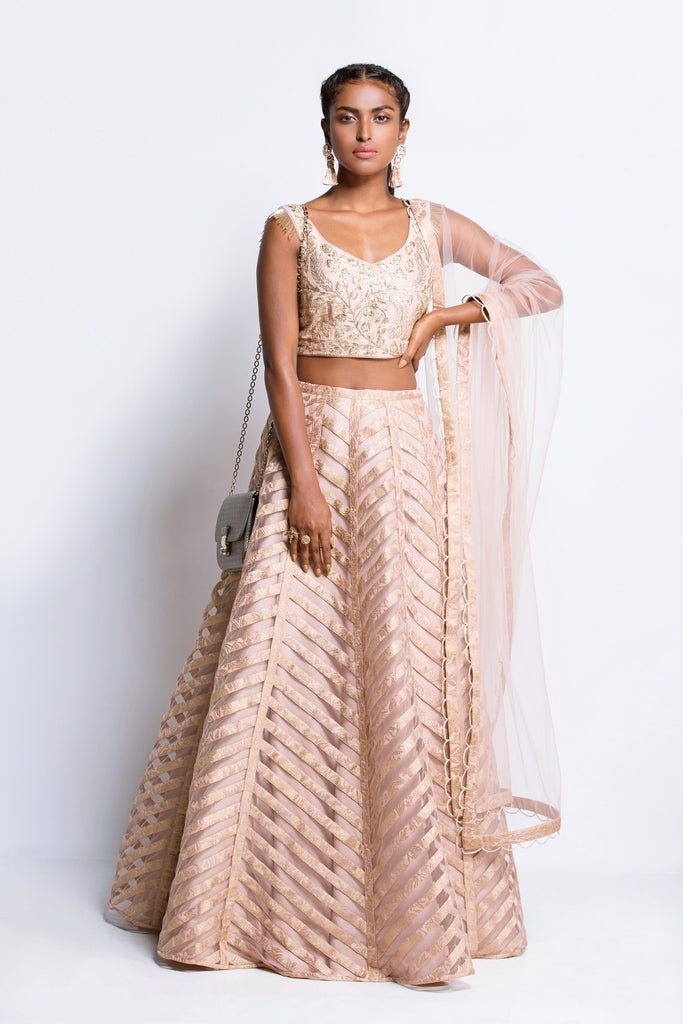 Designer Payal Singhal: blush silk embroidered blouse with brocade strip appliqued skirt and net dupatta