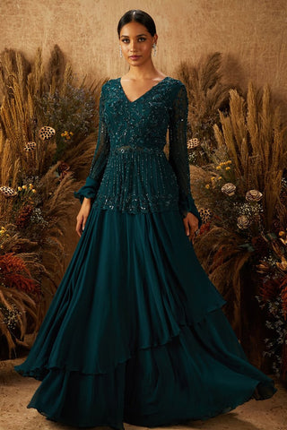 Dark green georgette hand embellished peplum top featuring bell sleeves, a tie back and self rafia floral & linear embellishment. Paired with a layered goergette skirt & a ruffle dupatta.