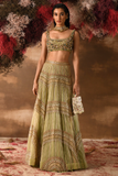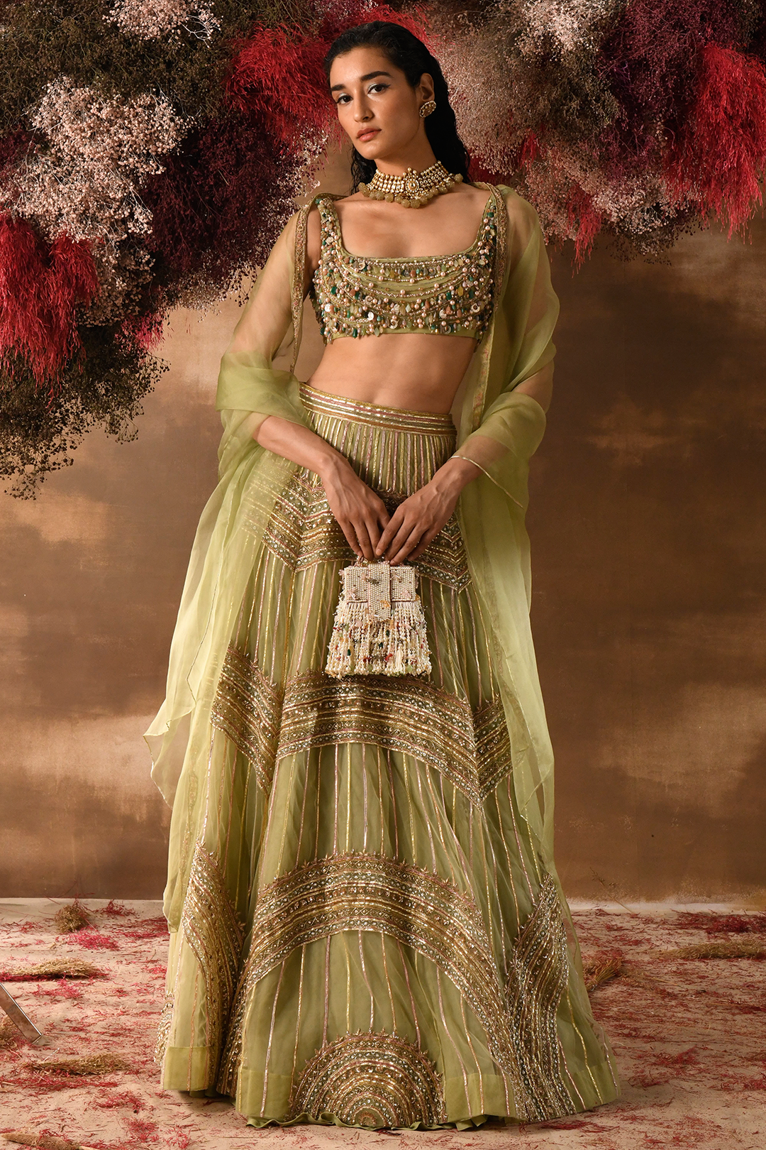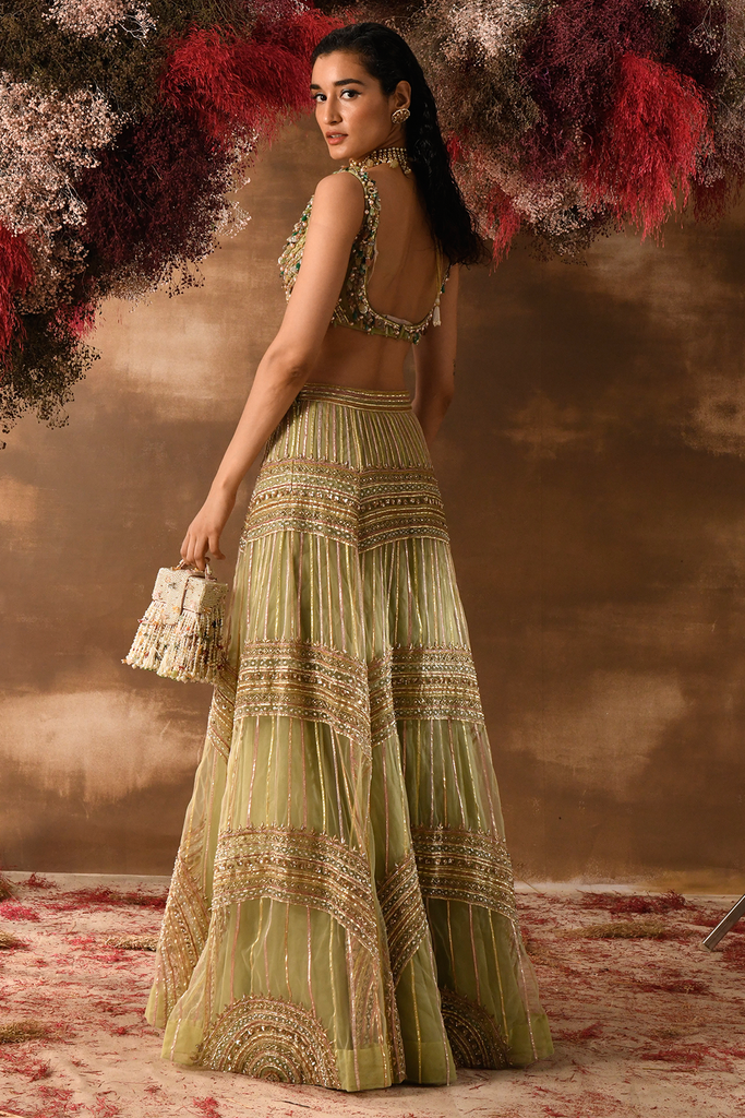 Light apple green jewelled blouse paired with net lehenga with gota detailing and an embroidered organza dupatta.
