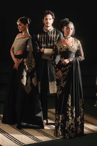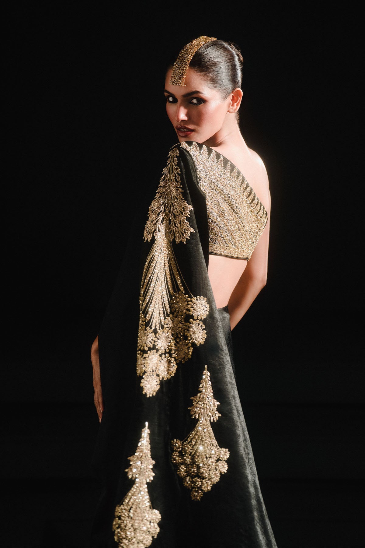 Description:The Kala Khatta Saree Gown defines tradition with a contemporary narrative. Inspired by the beautiful 'Kusum Kali' motif that showers down the pallu in bright gold sitara and moti embroidery. It has a one shoulder blouse that is elegant yet youthful and is completely embelished with our tricone border and a medley of motifs.