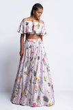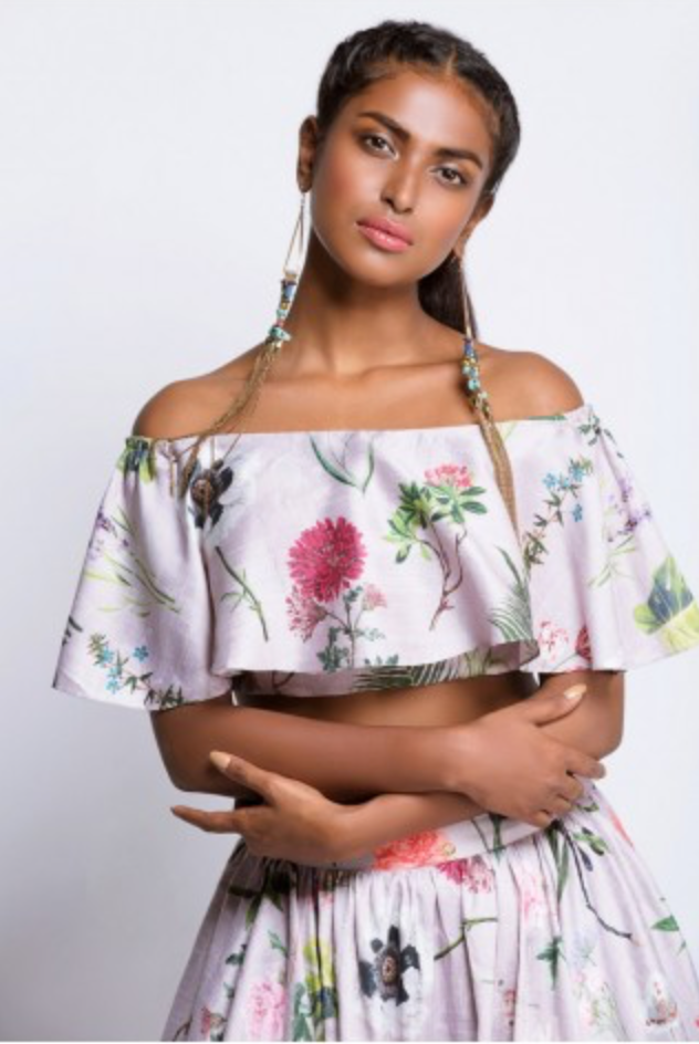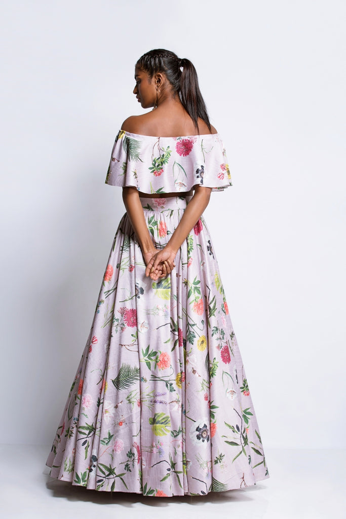 Designer Payal Singhal: Lilac printed ruffle blouse with matching skirt.