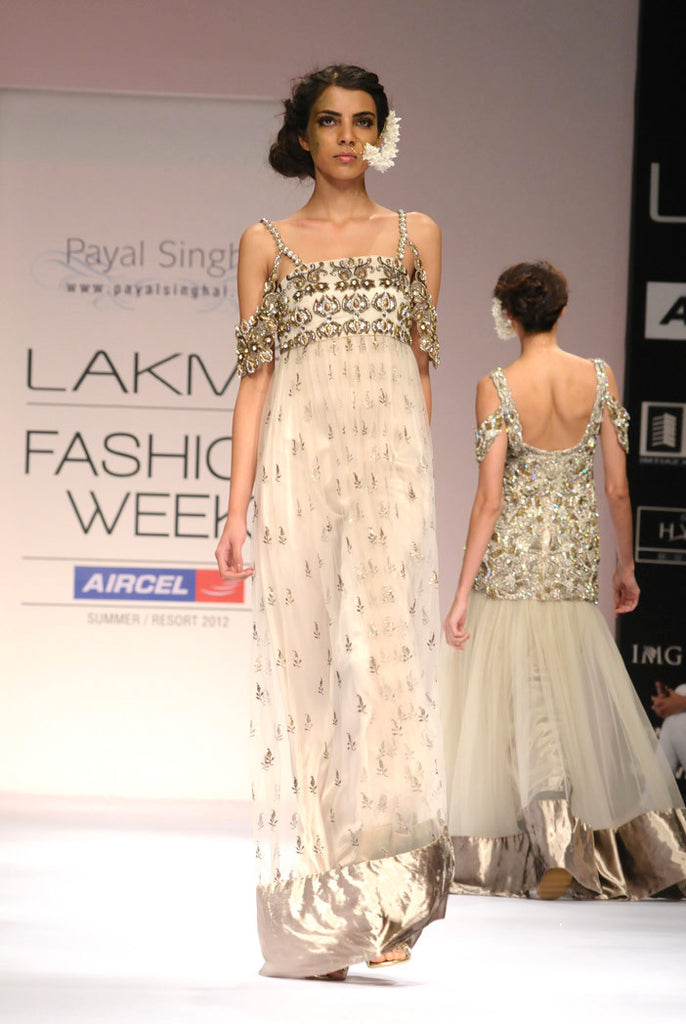 Designer Payal Singhal: Champagne patti mukaish tulle gown embellished with antique bronze and gota embroidery.
