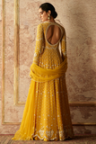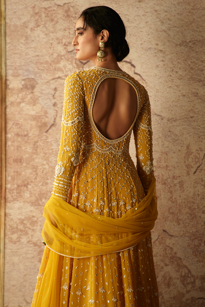 Golden yellow georgette embroidered anarkal with attached skirting paired with embroidered net dupatta.