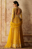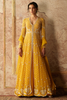 Golden yellow georgette embroidered anarkal with attached skirting paired with embroidered net dupatta.