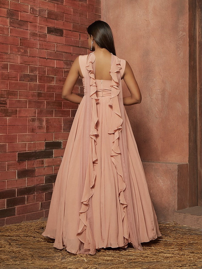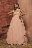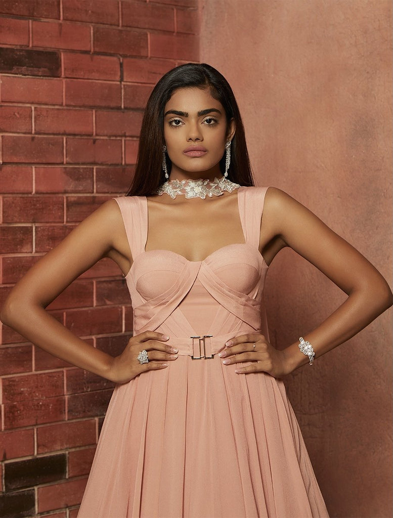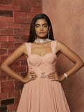 Soft pink crepe corset anarkali gown featuring pleat detailing & a belt. Hand Embellished pearl beaded neck ruffled dupatta