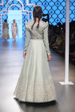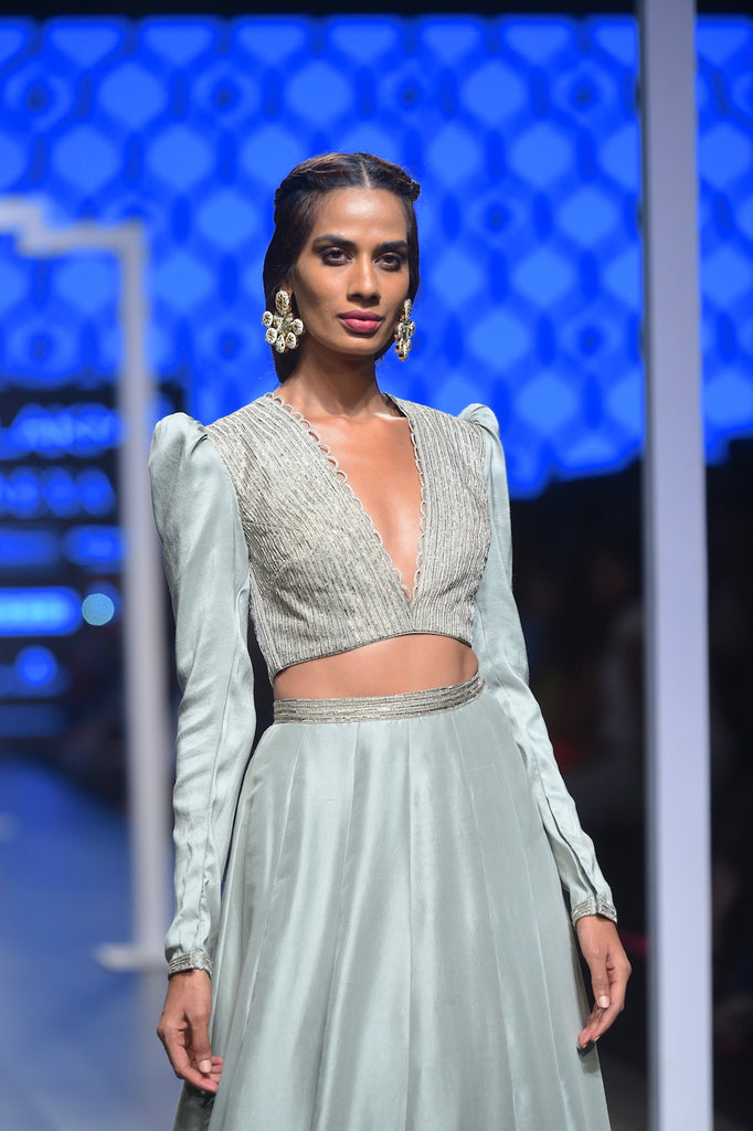 Designer Payal Singhal: Mint color silk embroidered puff shoulder blouse with embroidered lehenga skirt.