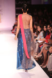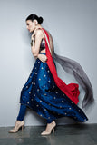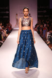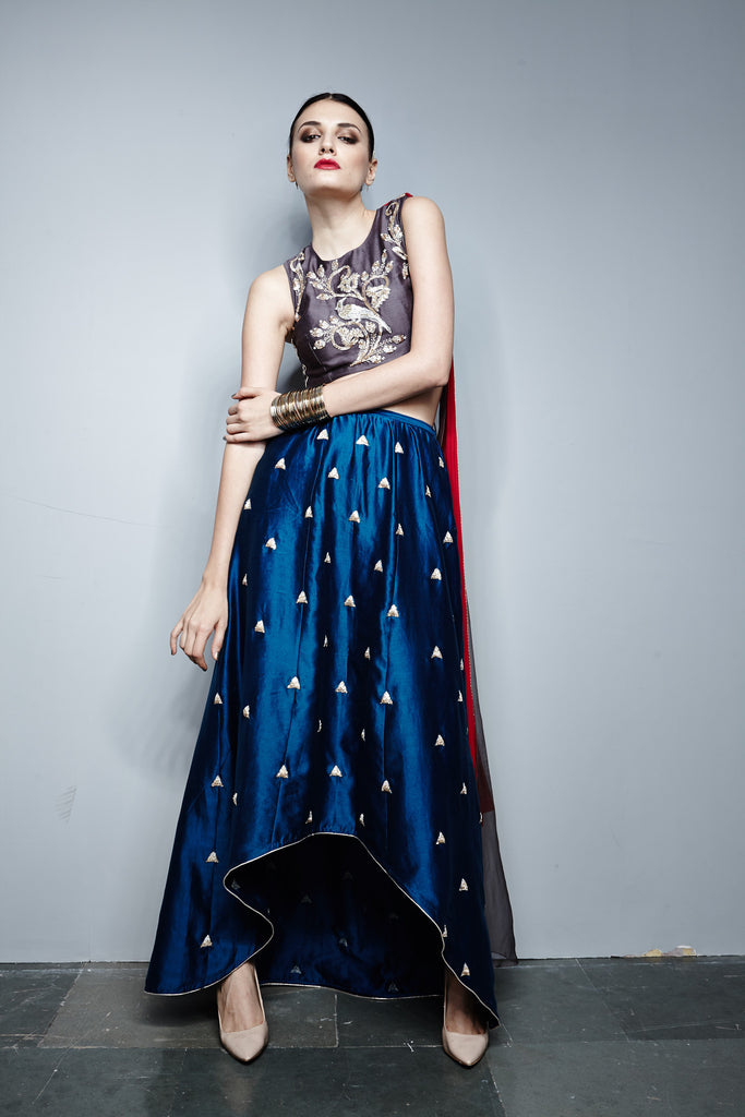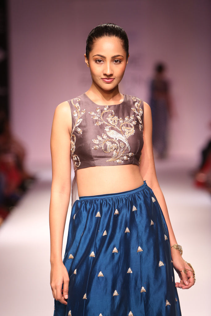 Designer Payal Singhal: Gun metal grey embroidered silk mul short choli and teal embroidered silk mul raised-hem churidar skirt.