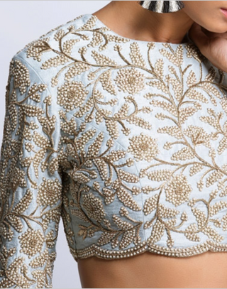 Designer Payal Singhal: Powder blue pearl gold embroidered blouse with embroidered skirt and scalloped border dupatta.