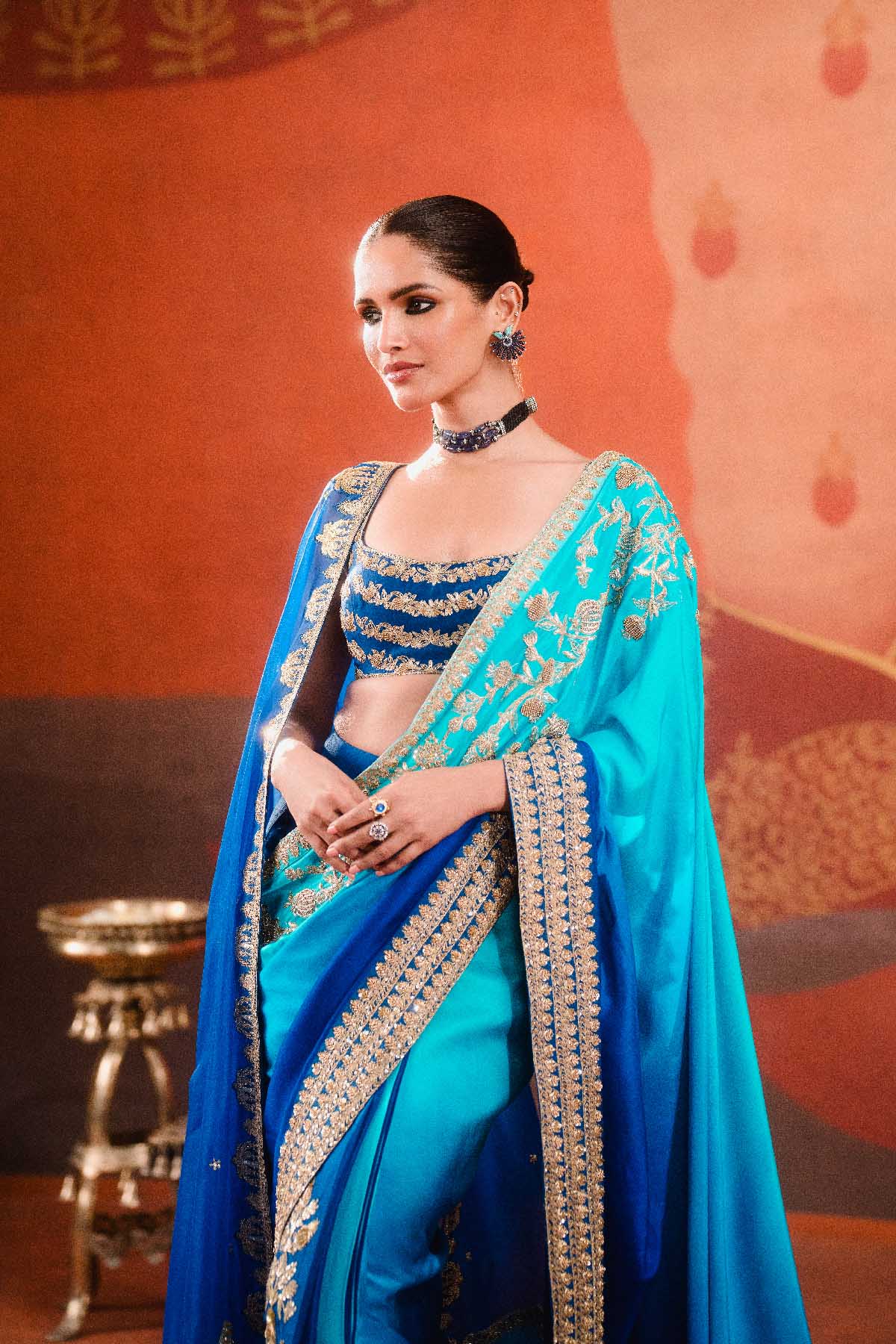 Description:A Poetic drape in vivid blue, The Sanjh saree encapsulates the eccentric aesthetic of the brand in all its zany ways. This ornate ombre saree in hues of the sky has an intricate border on all sides accentuated with an anar jaal. With color block pleats and and a hero motif adding to its beauty, this saree is for the woman who finds her spot at every occassion. The dupatta has patchwork detailing with ornate embroidery.