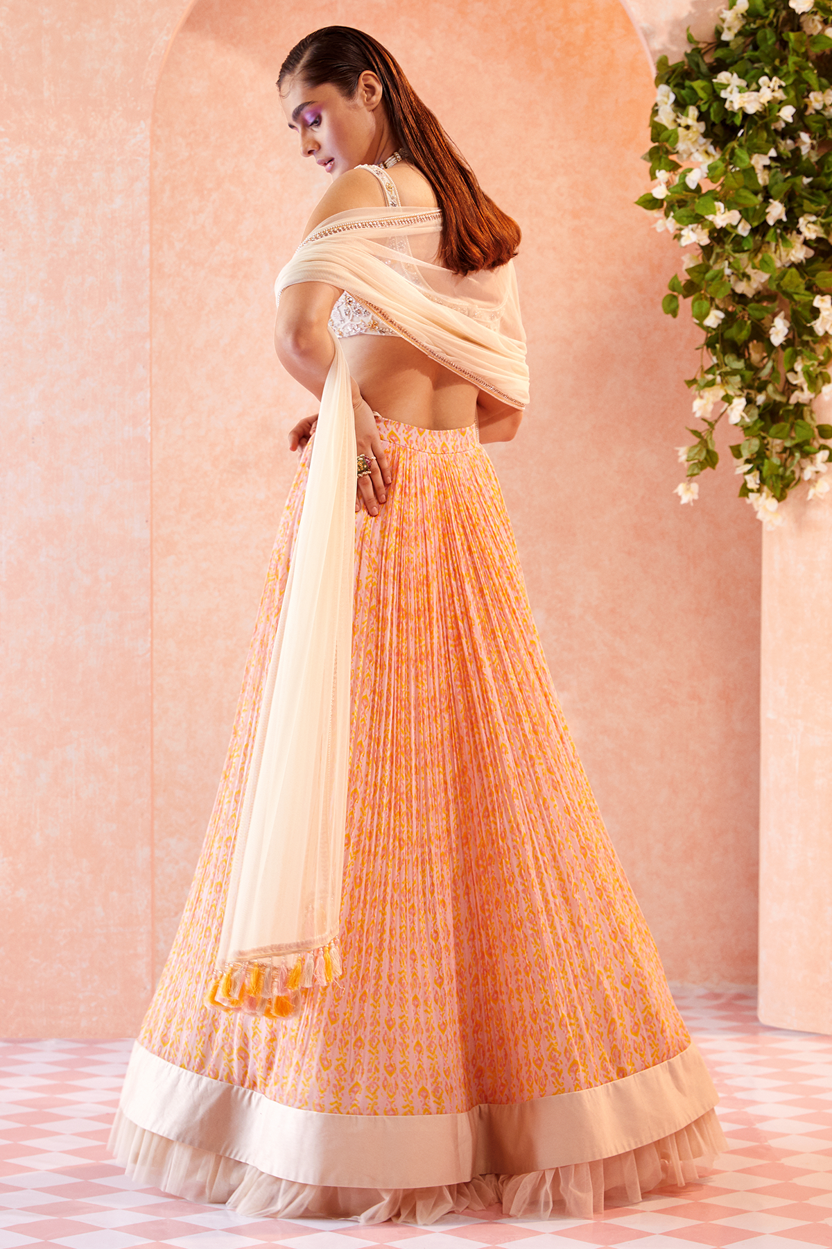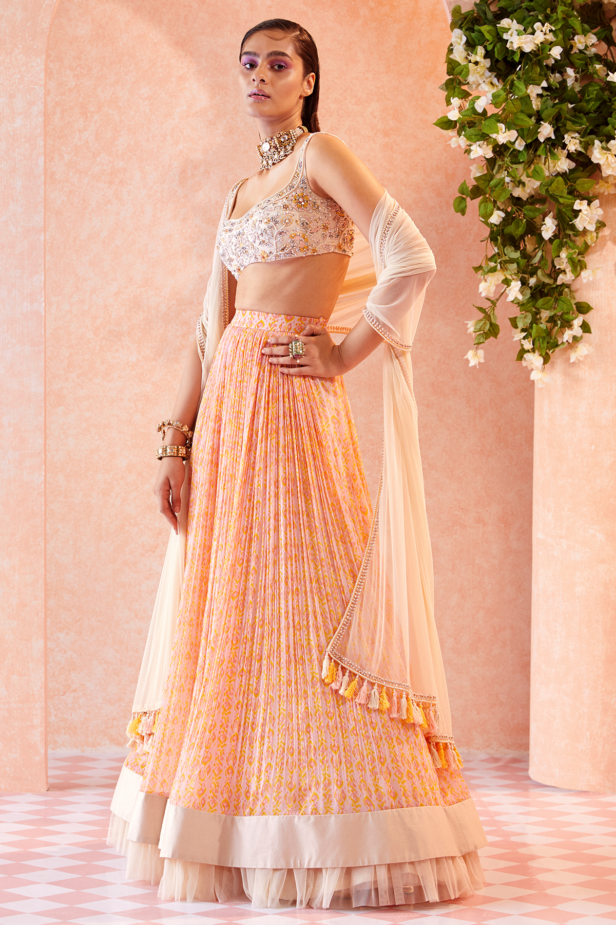 Dusty ivory embroidered bustier paired with Orchid Pink ikat printed ruched Skirt and embellished dupatta with tassel detailing