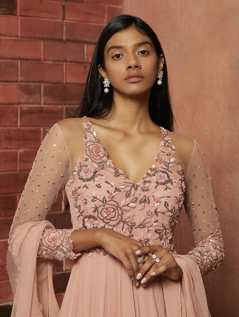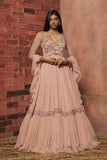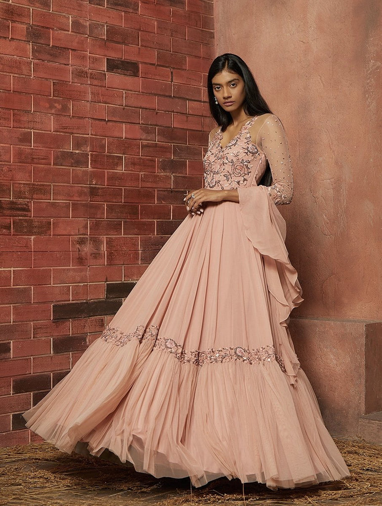 Soft pink georgette anarkali with self embellished body & sleeves, featuring a net tier with an embellished border. A tie back & a ruffle dupatta