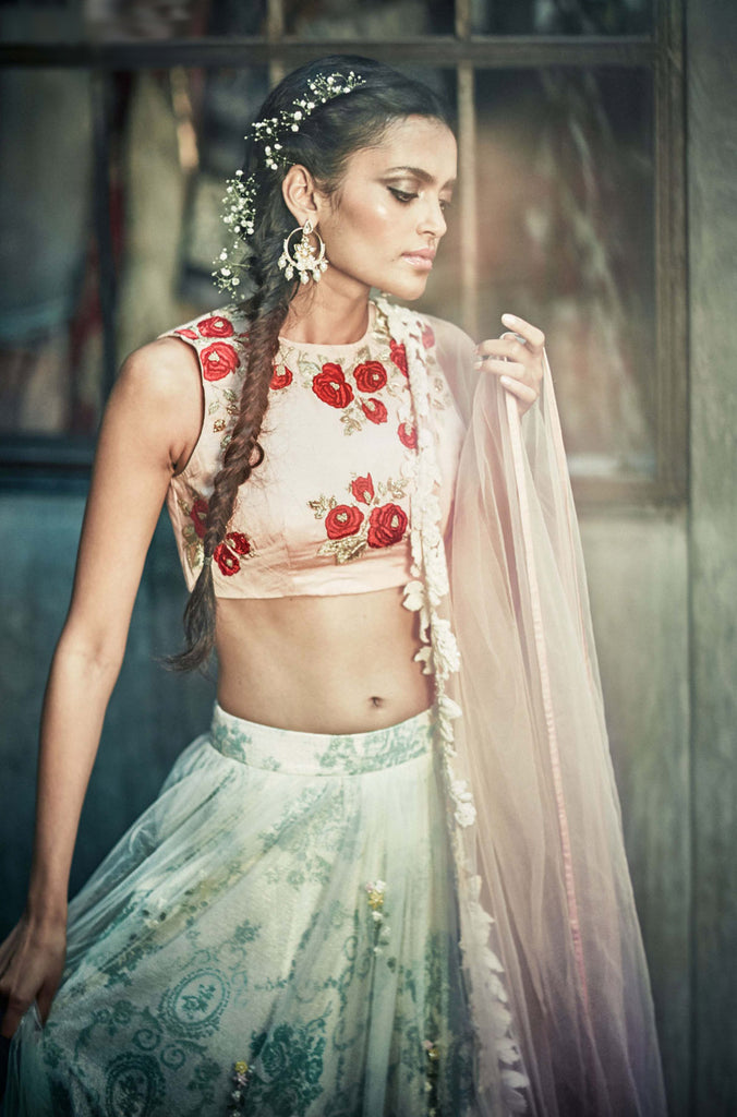 A pink raw silk choli set with red rose embroidery, mint tulle over layer upon high waisted skirt, and matching pink tulle dupatta.