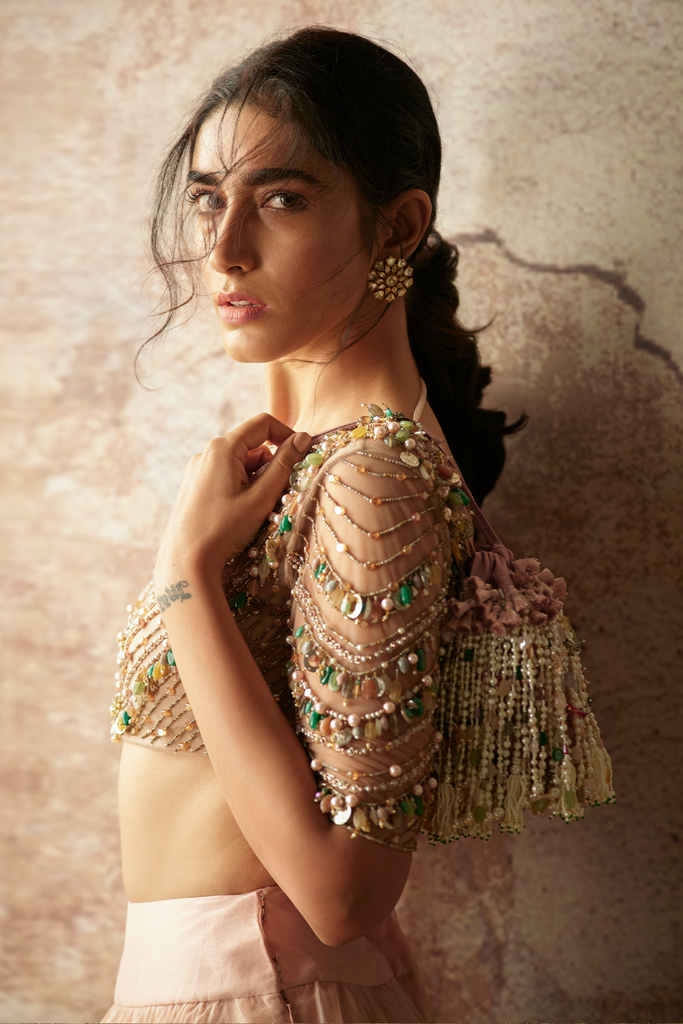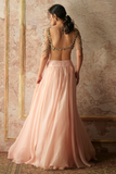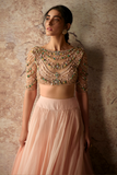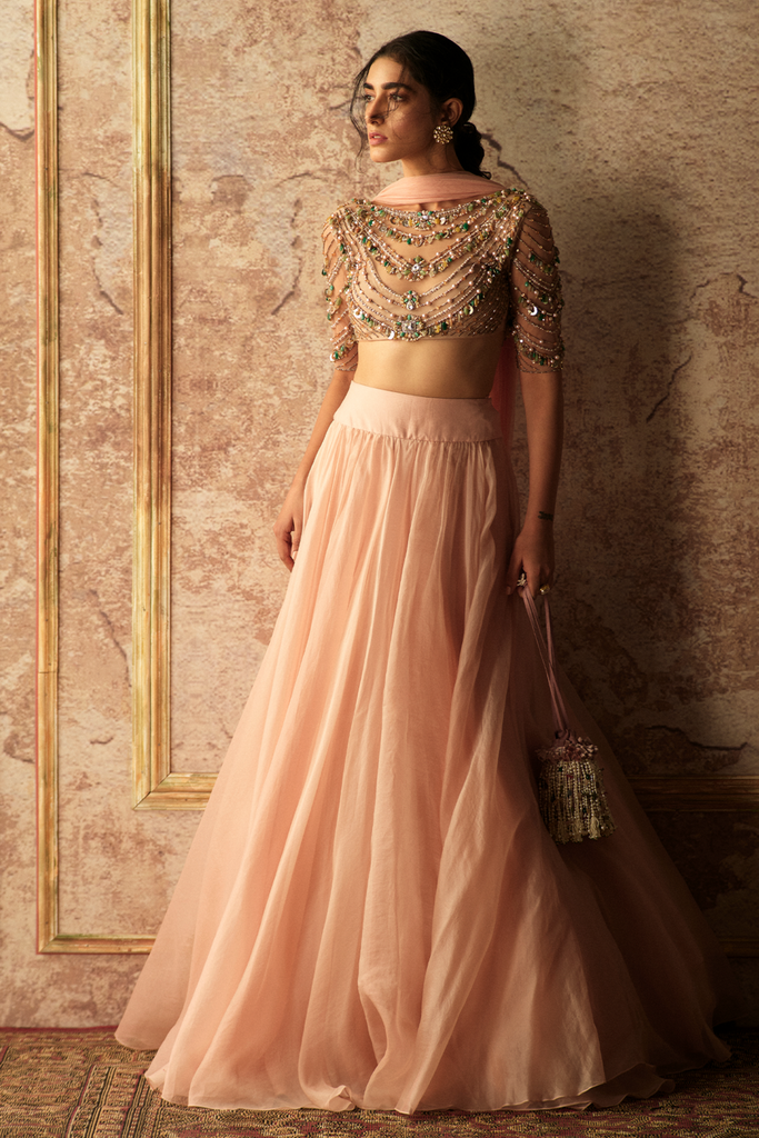Champagne embroirdered jewel blouse paired with a peach organza skirt and an embroidered dupatta.