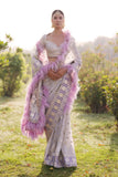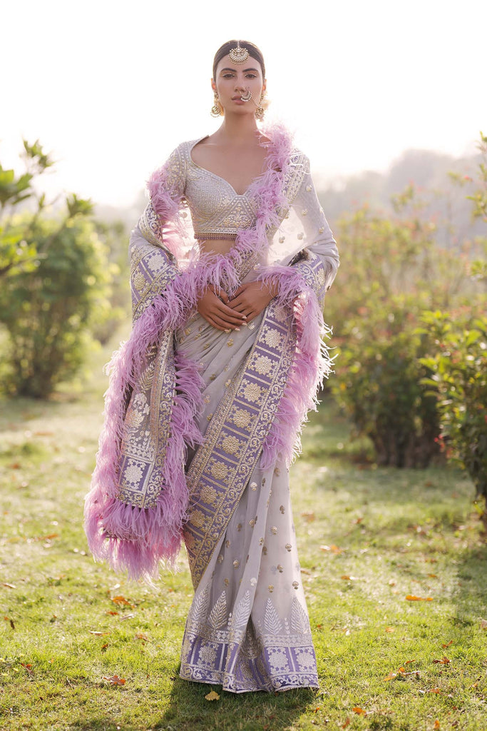 - LIGHT MAUVE, TULLE-BASED SAREE WITH TRADITIONAL MOTIFS IN LIGHT GOLDEN CHROME APPLIQUE DETAILS AND A LUSCIOUS PURPLE FEATHERED-BORDER. THE SAREE IS STYLED WITH A FULL-SLEEVES BLOUSE REPLETE WITH TASSLE DETAILS