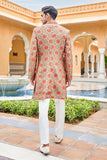 In deep green, with bold red patterns, our Trish sherwani depicts the understory of a forest. With unexpected colour play and precise edges, this sherwani keeps you comfortable while maintaining style.