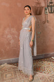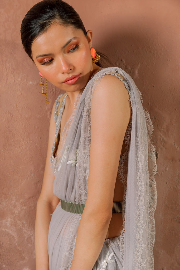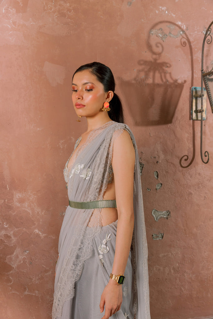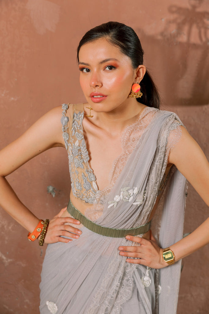 Vintage gray serenity sari embroidered in zardosi with vintage roses; hand embroidered slinky tulle blouse, serenity roses, glass beads, zardosi, belt hand embroidered in silver glass beads