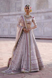 - LIGHT PINK-BASED, LIGHT GOLD CHROME APPLIQUE LEHENGA WITH FOLIAGE MOTIFS AND FLORAL AND ARCHITECTURAL MOTIFS ON PINK AND MAROON PATCHES. THE LEHENGA IS STYLED WITH A MULTICOLOURED CHROME APPLIQUE BLOUSE WITH TASSLE DETAILS AND A TULLE DUPATTA WITH MAROON-FRINGED BORDER.