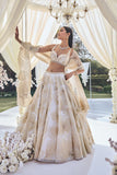 Seema Gujral: This lehenga set features bright gold floral applique motifs on an-off white net base and is paired with a strappy blouse and a scalloped jaal embroidered dupatta.