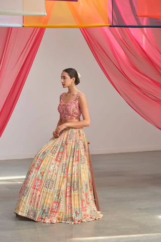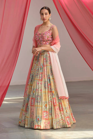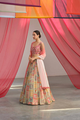 Festive, Hand Work Detailing, Bright Colours, Fresh And Festive, Pink Floral Blouse, Silk Printed Lehenga Highlighted With Hand Work All Over, Summer