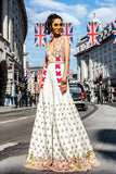Designer Papa Don't Preach: An ivory riveted silk bridal floral jumpsuit having metal sequin, stones, beads and bangle embroidery. It is paired with an ivory cut work gold sequins embellished belt.