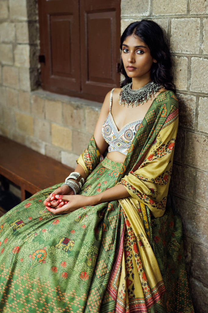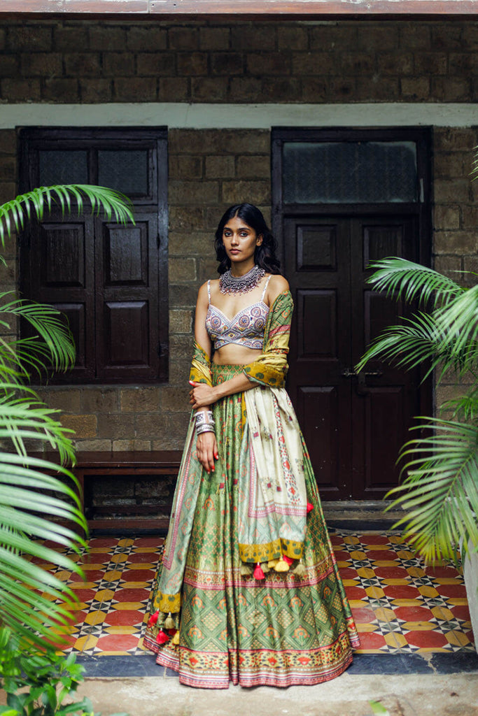 Botanical Lehenga in a fresh indian green with inticrate detailing teamed with a white hand beaded bustier & an olive green duppata.