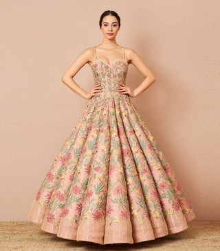A pink organza multi-thread and sequins embroidered corset ball gown, emanating a beauty unmatched.