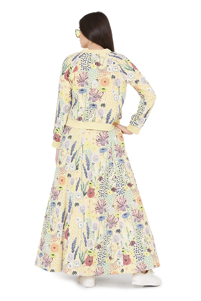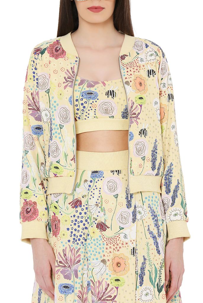 Designer Payal Singhal: YELLOW COLOUR PRINTED ART CREPE BOMBER JACKET WITH BUSTIER AND LEHNEGA