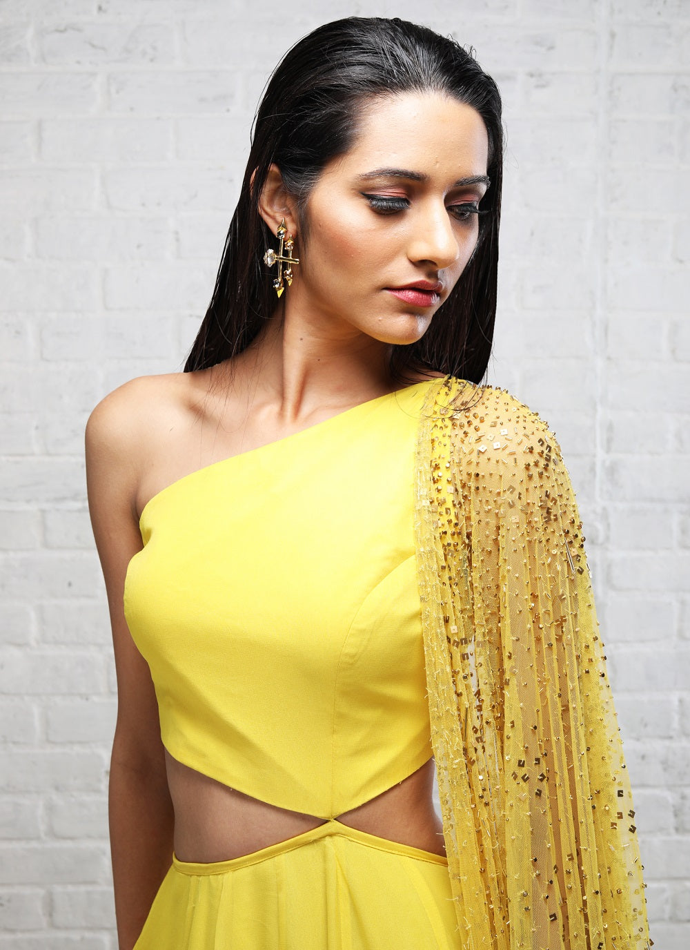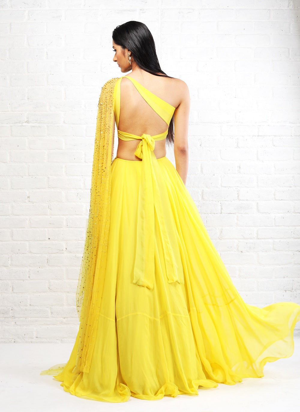 Yellow anarkali with cut out waist and embellished yellow-lime dupatta.