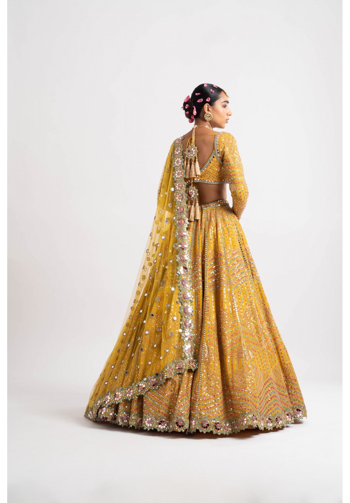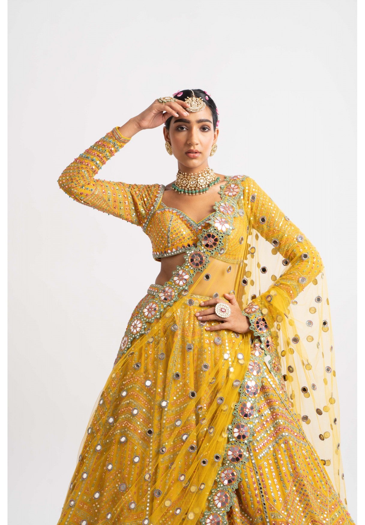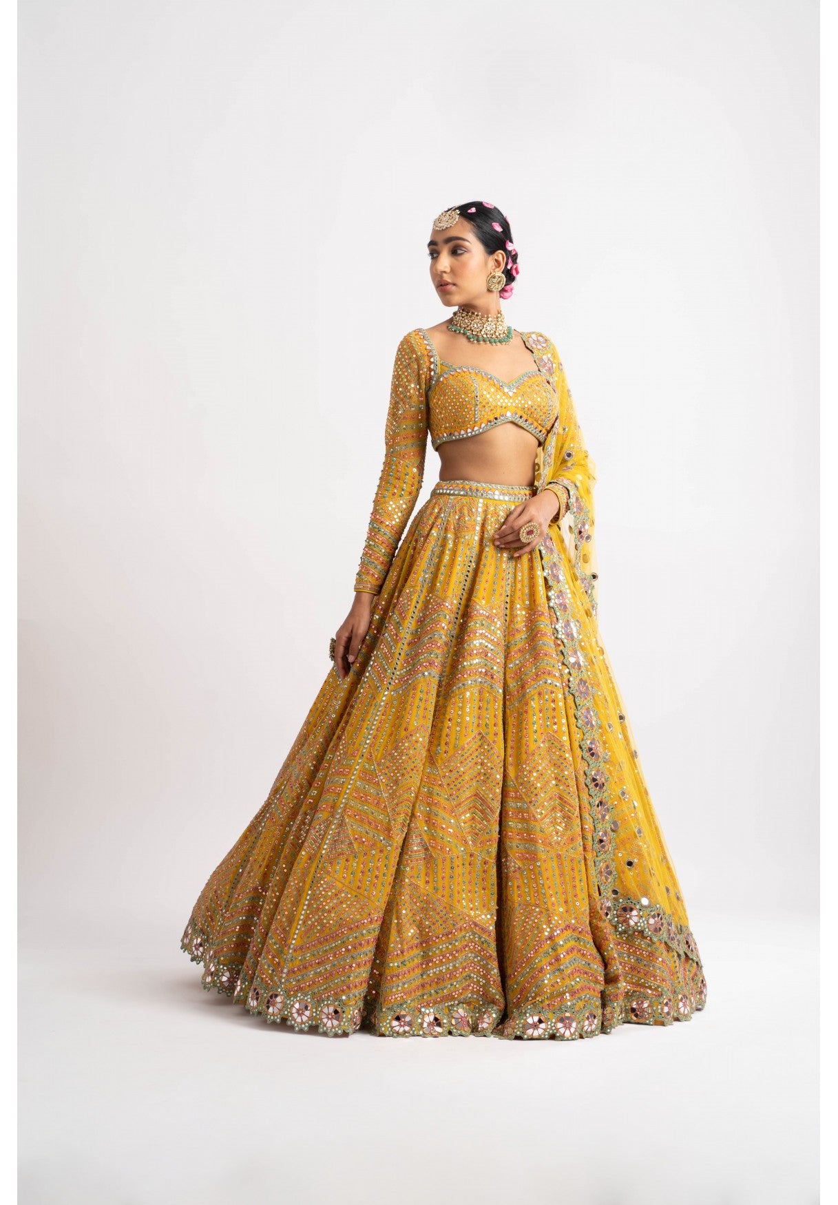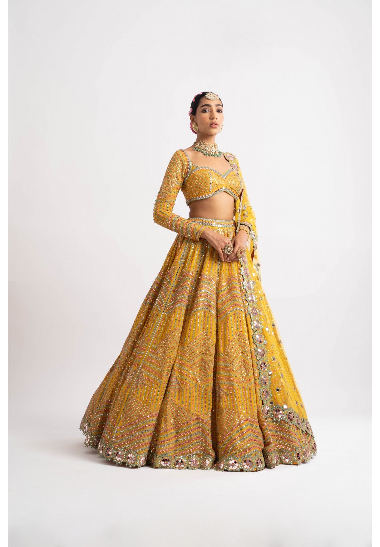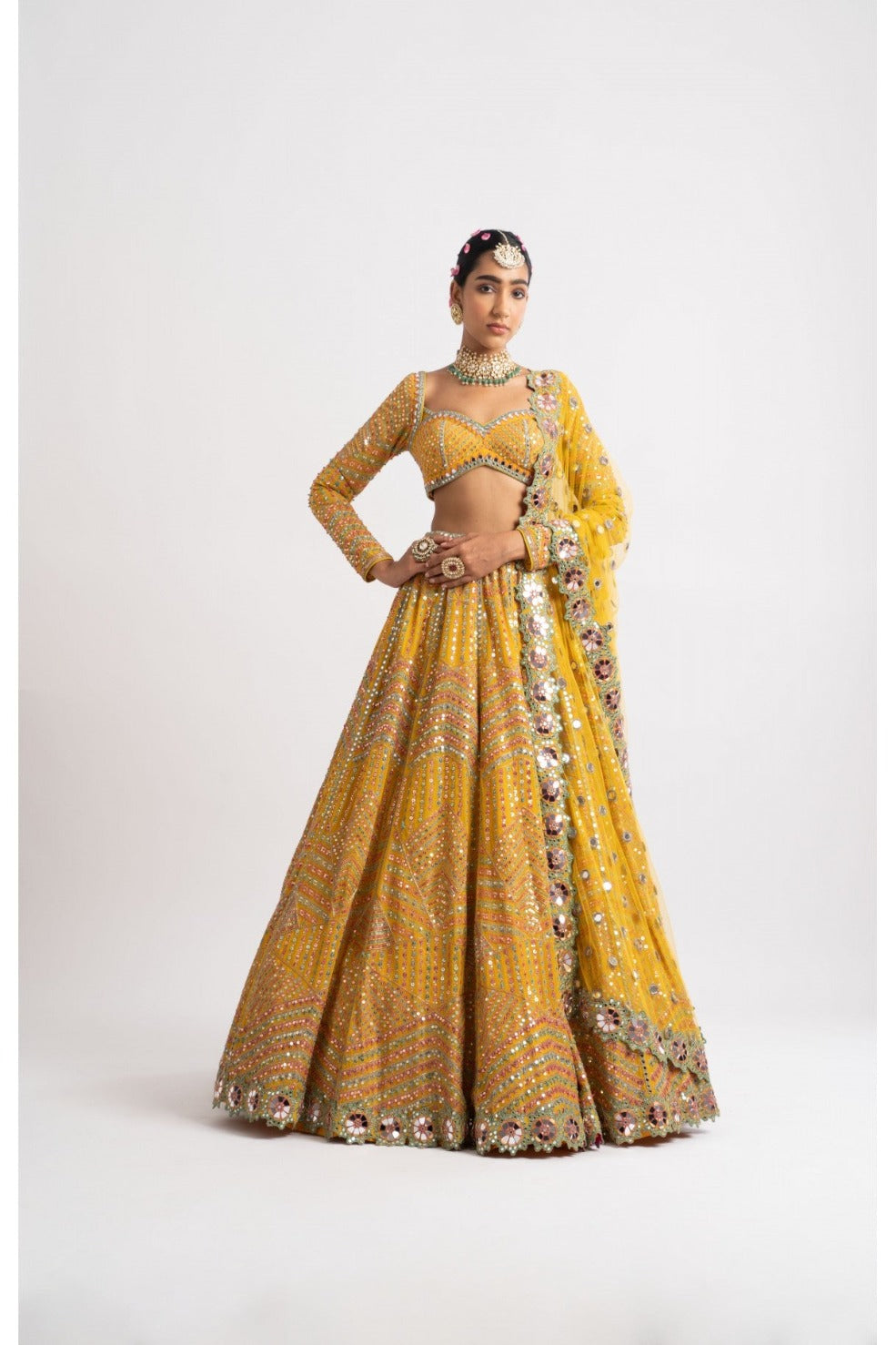 Intricately hand embroidered with thread zari and sequins sweetheart blouse, lehenga and a heavy mirror cut work net dupatta.
