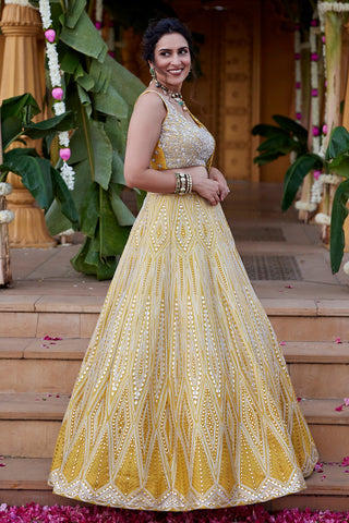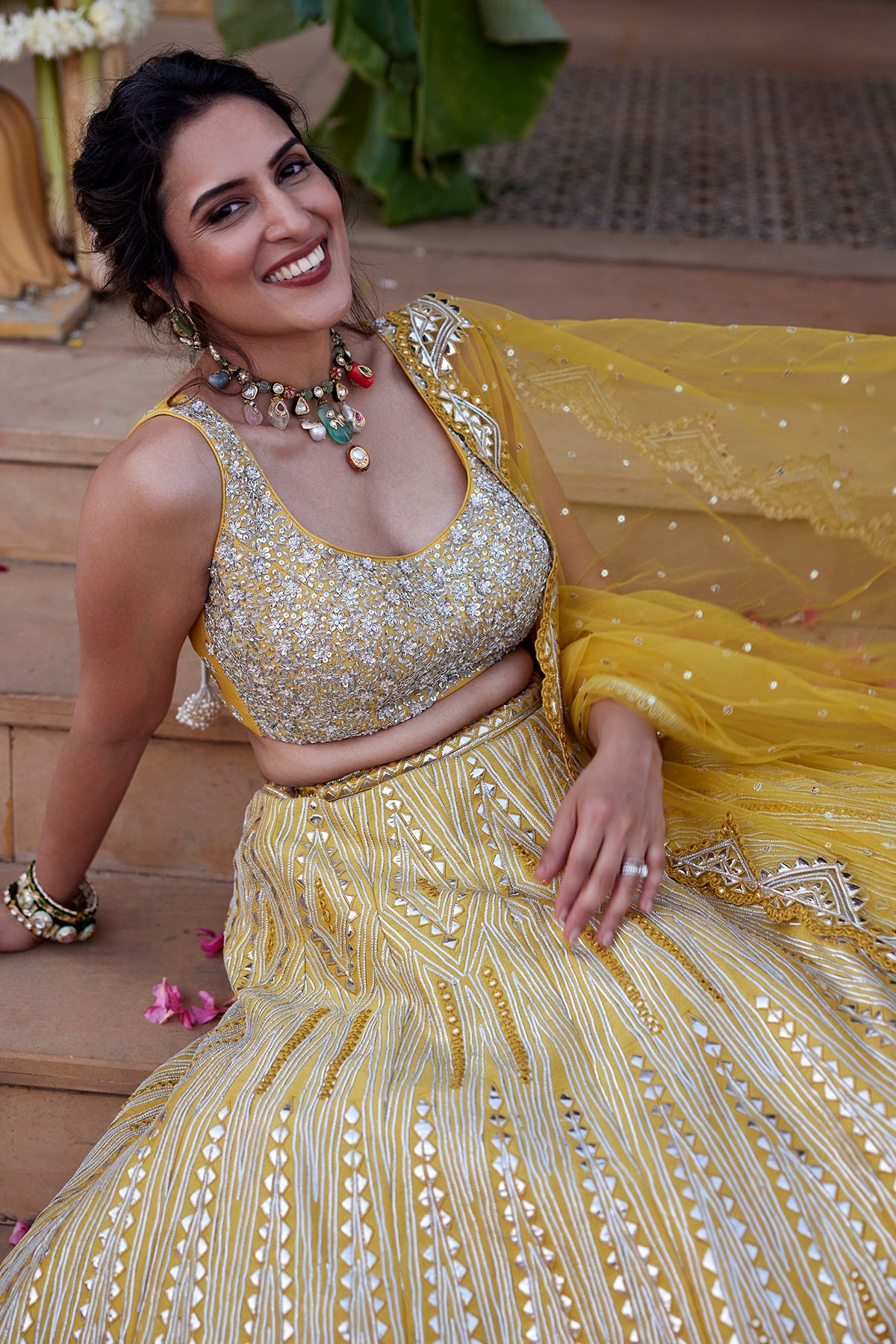 Geometric mirror and leather applique embroidered skirt in silver on yellow dupion silk fabric paired with heavily embroidered blouse and tulle dupatta with scallop border and pearls and sequence detailing.