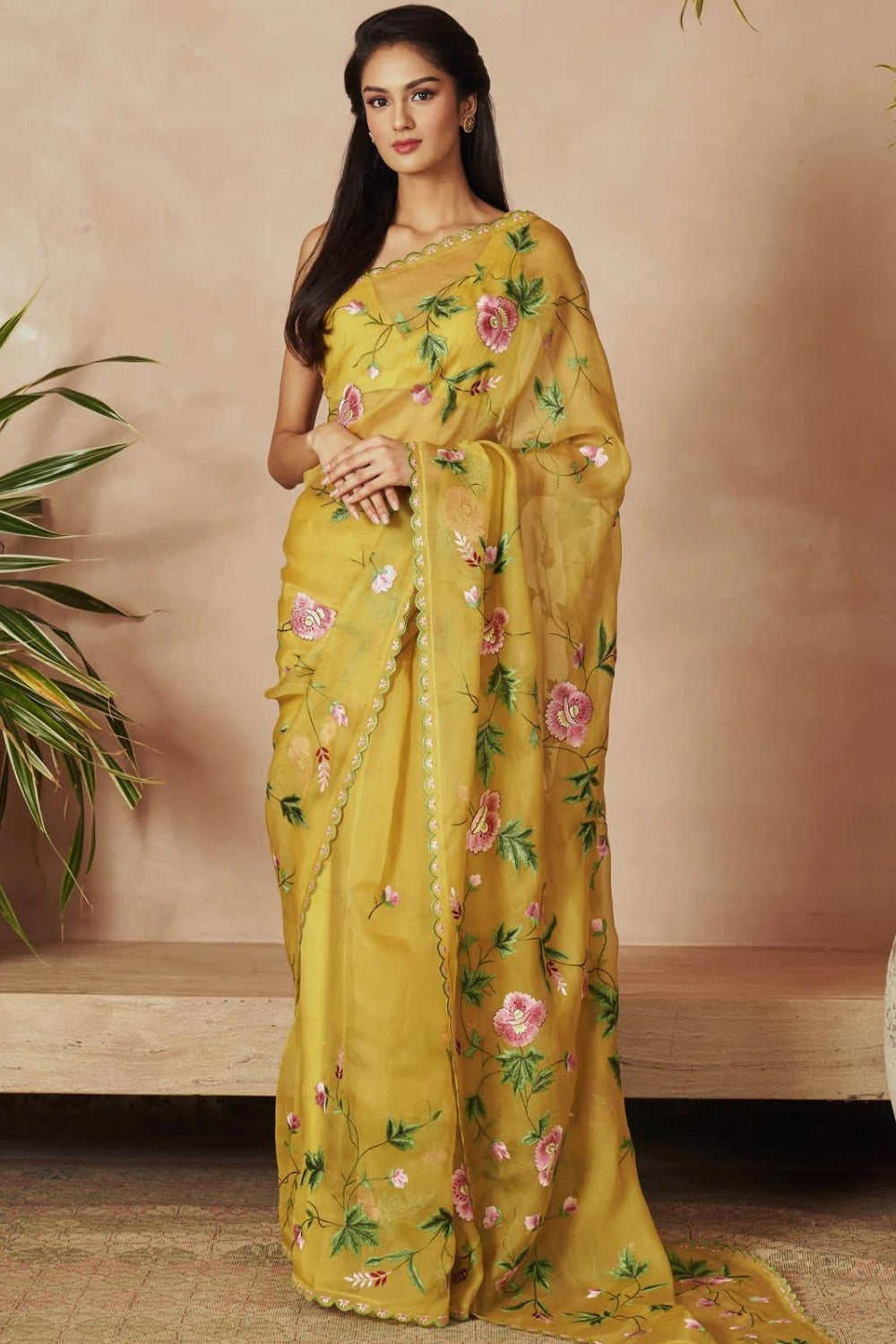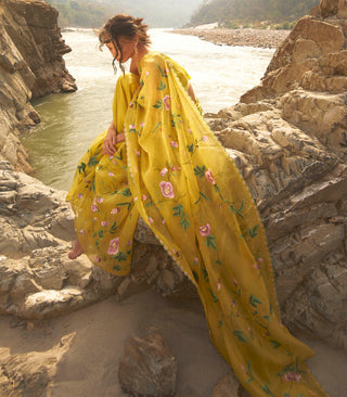 YELLOW ORGANZA GULBAHAR SAREE SET